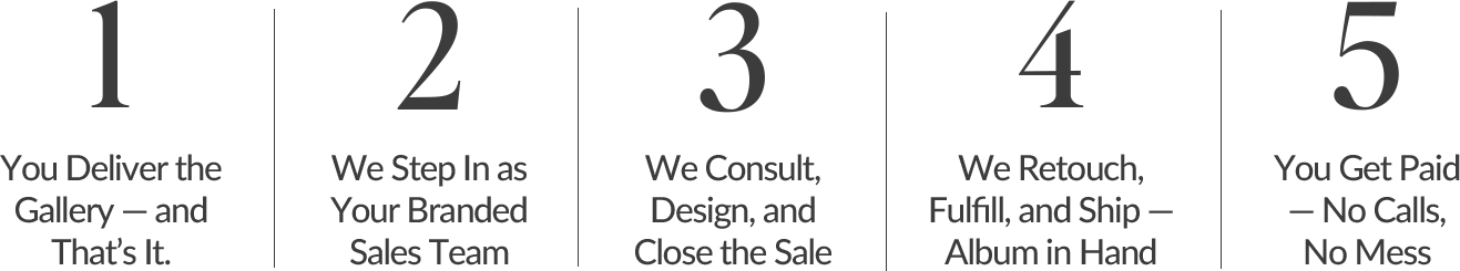 Turn your existing client sessions into high-ticket album and print sales - fully done-for-you, under your brand, and without you picking up the phone.